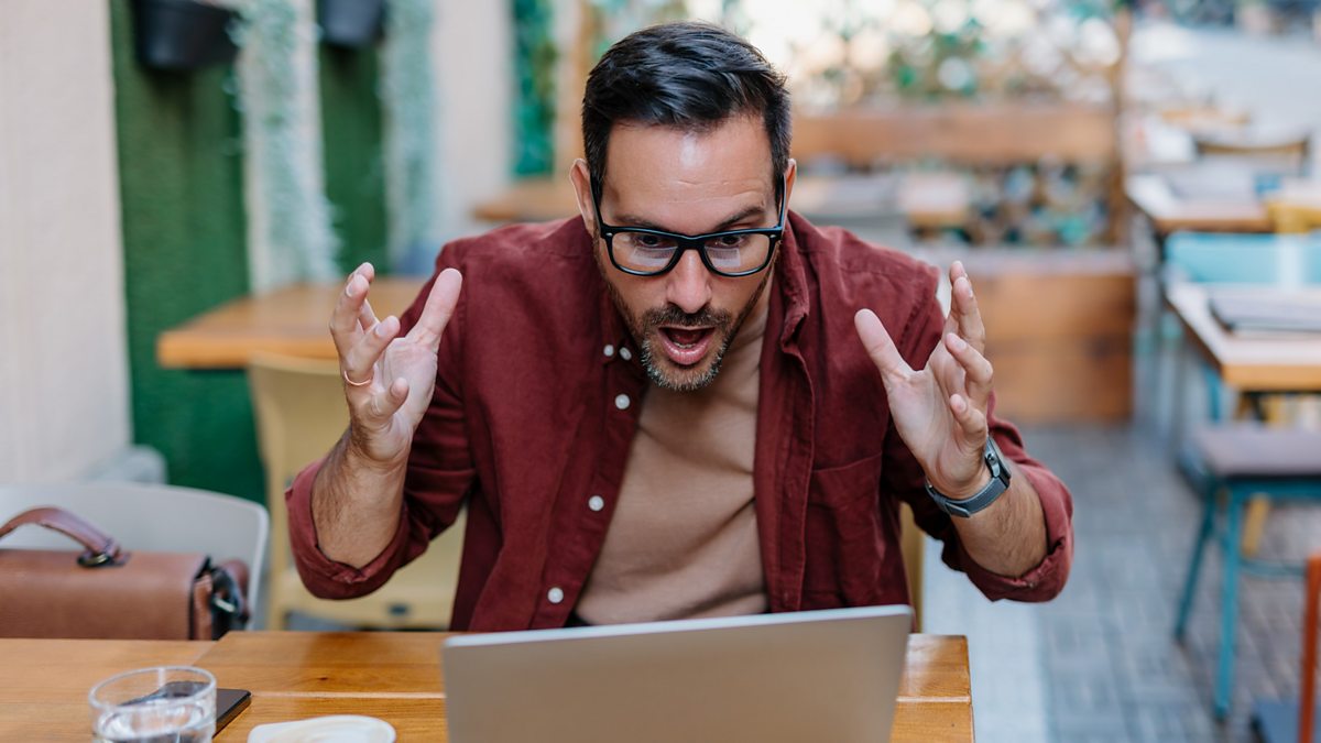 (Picture: A man dramatically gestures towards his laptop, conveying surprise. Credit: Getty Images)