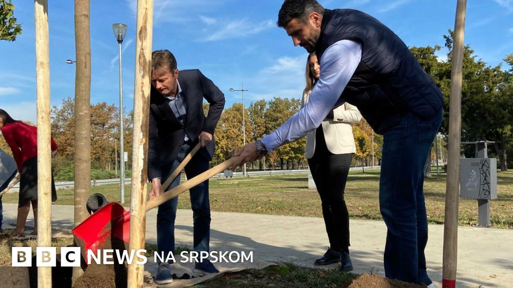 Spustio je Jovanov potom lopatu na zemlju, a Obradović kantom za zalivanje, uz pratnju škljocanja fotoaparata, sipala malo vode preko sveže nabacane zemlje.