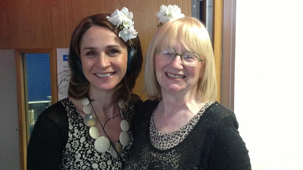 Nia Roberts yn sgwrsio gyda Hannah Roberts am flodau'r coeden ceirios.