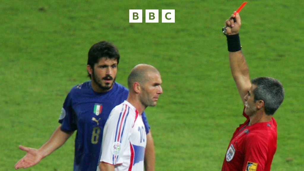 In 2006, the legendary French player Zinedine Zidane was sent off in the World Cup final in his last game before retirement. In a shocking incident, Zidane had head-butted the Italian defender, Marco Materazzi. Witness speaks to Horacio Elizondo, the referee who showed him the red card. The programme is a Whistledown Production for BBC World Service. (Photo: Horacio Elizondo (right) holds up a red card to Zinedine Zidane (centre). Credit: Getty Images)