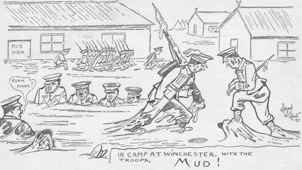 In the winter of 1914, thousands of troops were based at Morn Hill near Winchester, preparing for war. But their plans were thrown into chaos by the wettest local December on record. Rain turned the camp into “a sea of liquid mud”. It sparked a full-scale evacuation – and 12,000 men were sent to Winchester to find shelter. Soldiers reported horses disappearing up to their chests in mud. Major General Thomas D’Oyly Snow, commanding the 27th Division, said the camp in Winchester was far worse than anything experienced in Flanders afterwards: “It was the first time and the last that I have ever seen troops allow themselves to be defeated by the weather.” To escape the mud, troops were billeted in accommodation ranging from private homes to schools. A few weeks later, they marched to Southampton bound for the Western Front. Some men dropped out along the road and mud-caked equipment was abandoned. Location: Morn Hill, Hampshire SO21 1HE Image: Cartoon of mud at Morn Hill camp by the cartoonist Howard Lloyd Roberts who died in 1935 Presented by Marcus White