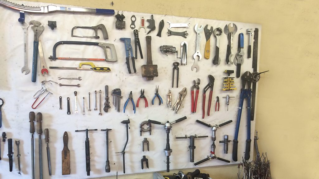 “It’s like night and day” Chris describes the difference Common Wheel and bike engineer, Neil have made to his life (Photo caption: A selection of tools used for bicycle maintenance by Common Wheel in Glasgow © Claudia Hammond)