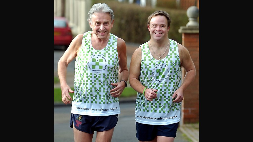 In 2007, Simon Beresford became the first runner with Down's Syndrome to complete the London Marathon. Simon has gone on to run several more marathons and raise tens of thousands of dollars for charity. Rebecca Kesby met Simon, his running partner and his parents at their home in the English Midlands. PHOTO: Simon Beresford and running partner, John Dawson (Family Collection)
