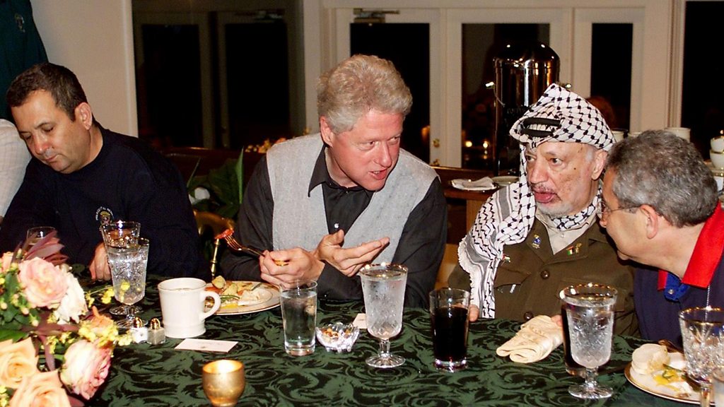 In 2000 the US led a major effort to end the Israeli-Palestinian conflict. President Bill Clinton brought the two sides together at the leafy presidential retreat in Maryland. The Israeli leader, Ehud Barak and the Palestinian leader, Yasser Arafat, failed to reach any agreement and the summit ended in failure. Farhana Haider has been speaking to the senior American diplomatic interpreter and policy adviser, Gamal Helal who attended the Camp David summit. White House photo released 16 July 2000 US President Bill Clinton (C) Israeli Prime Minister Ehud Barak (L) and Palestinian Chairman Yassar Arafat and Gamal Helal at a working dinner at Camp David, Maryland during the Middle East Peace Summit. Credit: SHARON FARMER/AFP/Getty Images