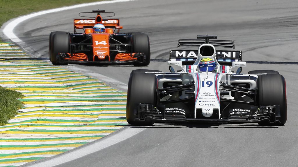 Williams' Felipe Massa holds off McLaren's Fernando Alonso to finish seventh in his final home race. This clip ir originally from 5 live Formula 1 on Sunday, 12 November 2017.