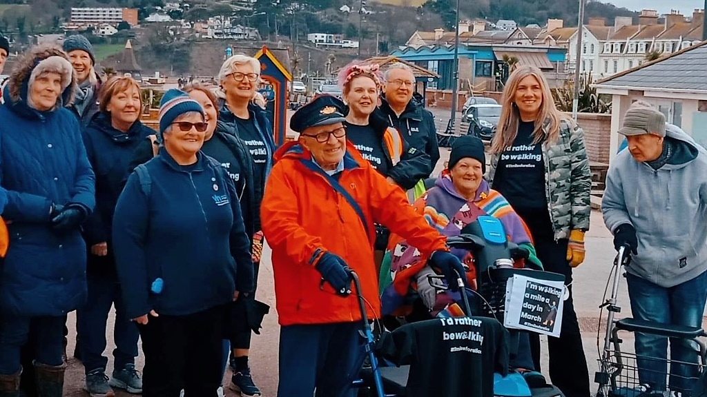 Retired postie walks a mile a day in March aided by his trusty wheeled walker to raise funds for his local Community centre