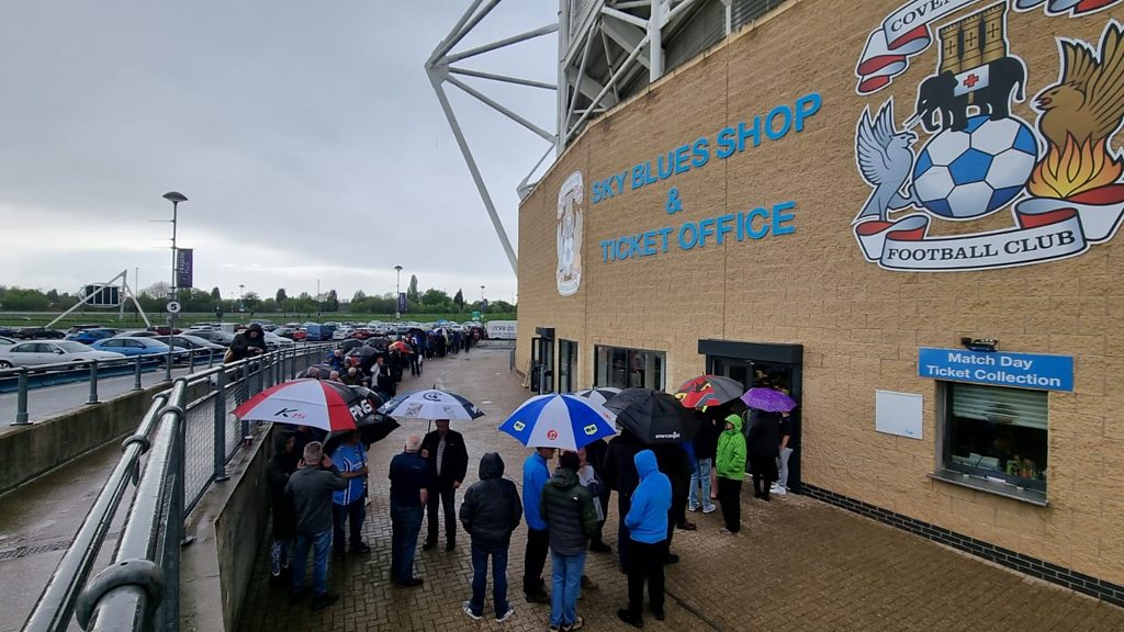 An estimated one thousand Sky Blues season ticket holders queued at the CBS Arena to get tickets for the city's play-off semi-final first leg against Middlesbrough. The club put them on priority sale this morning before they go on general sale. Some fans told BBC CWR the website was too confusing so they went to the ground instead. Lorna Bailey sent reporters down to find out more.
