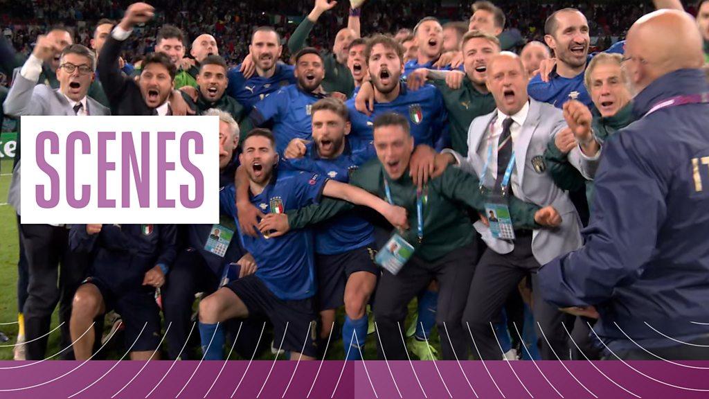 Watch the scenes at full-time as Italy advance to the finals of the European Championship, beating Spain 4-2 on penalties at Wembley after it ended 1-1 after extra time.