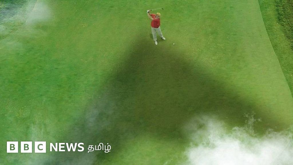 அலி காமனேயியின் அதிகாரபூர்வ வலைதளத்தில், ஒரு பெரிய போர் விமானம் அல்லது டிரோனின் நிழலில், டிரம்ப் கோல்ஃப் விளையாடிக் கொண்டிருப்பது போன்ற ஒரு படம் பகிரப்பட்டிருக்கிறது.