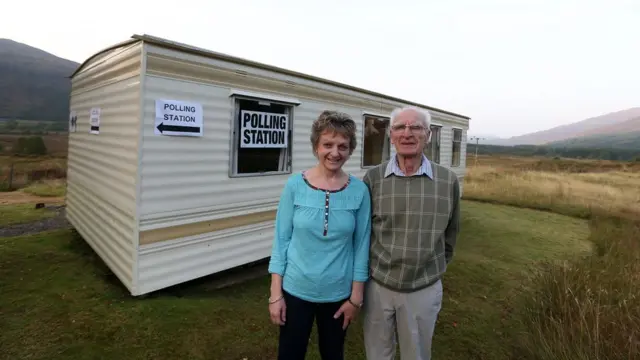 Ông George Mackay và con gái đã biến căn nhà di động của họ thành phòng bỏ phiếu ở cho 50 cử tri Coulags, gần Lochgarron, vùng miền núi Scotland.